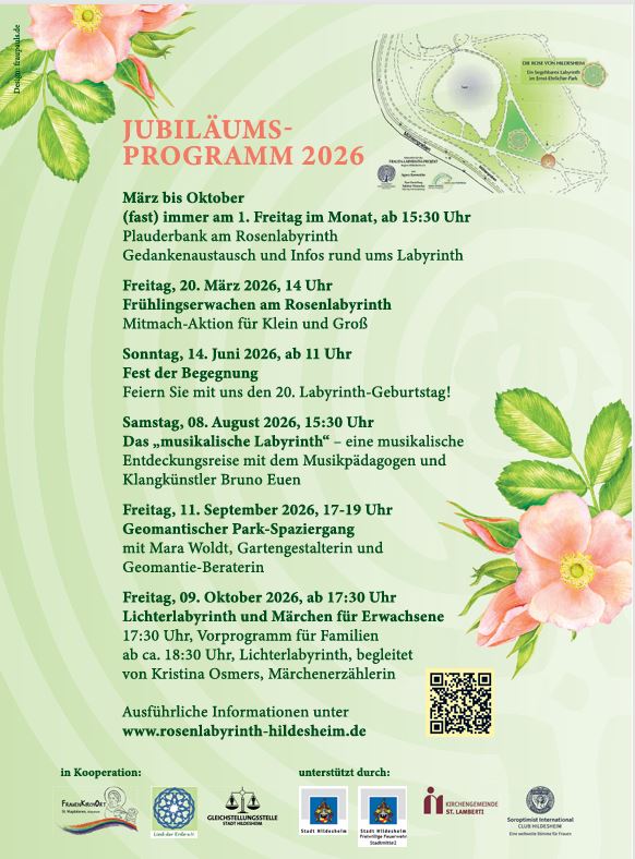 Das Rosenlabyrinth wird 20 Jahre alt und trägt seit 2006 zur kulturellen Vielfalt in Hildesheim bei. Für das Jubiläumsjahr sind übers Jahr verteilt unterschiedlichste Aktionen geplant, einige davon stehen bereits in unserem aktuellen Jahresprogramm.
